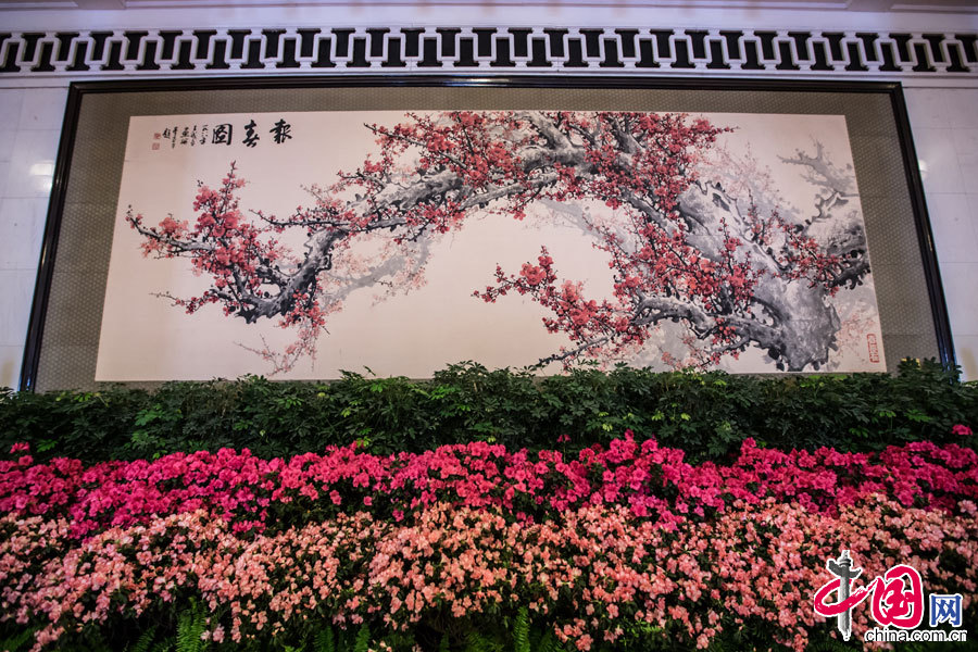 中国网讯(记者郑亮)3月13日,每年3月一年一度的全国“两会”都在北京人民大会堂召开,人民大会堂不仅外观气势恢宏,内景也金碧辉煌,布景装潢都集聚中华文明文化经典。大会堂每层都点缀着寓意美好的书画作品,中国网记者有幸参与全国“两会”报道,带您赏人民大会堂书画经典作品。