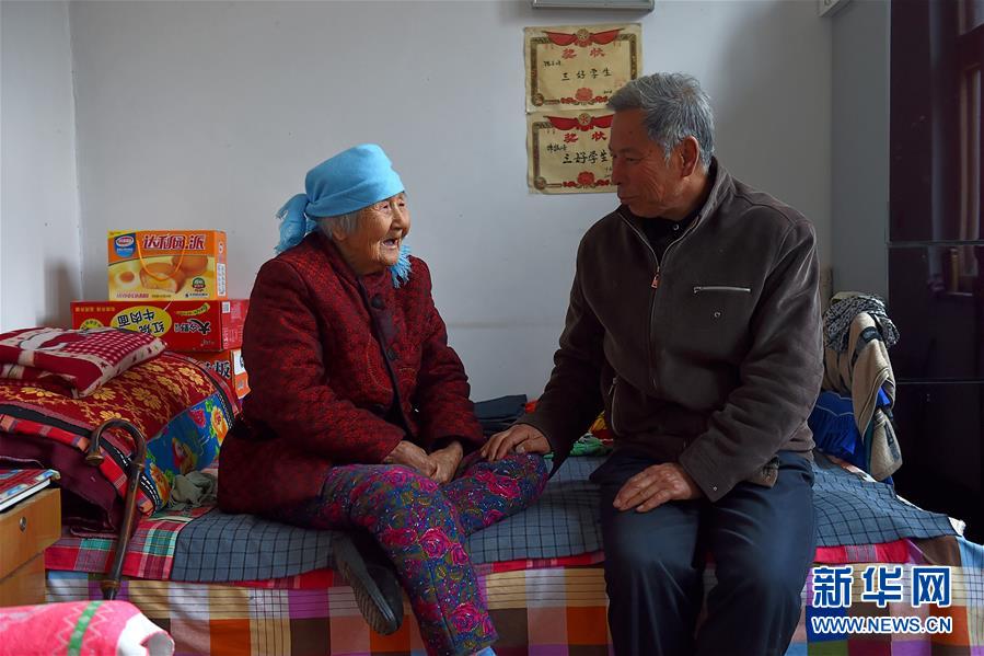 曹黑毛老人(左)在和长期研究“慰安妇”受害者的民间志愿者张双兵聊天(3月4日摄)。现年94岁的曹黑毛老人,家住山西省盂县下社乡七东村。1941年秋天,19岁的曹黑毛被日军抓到据点,遭受蹂躏怀了身孕,曹黑毛自己用肚子撞炕撞墙打掉了孩子。到1943年的秋天,曹黑毛才抓住机会偷偷溜出了据点,步行了几十里路回到家里。新华社记者詹彦 摄