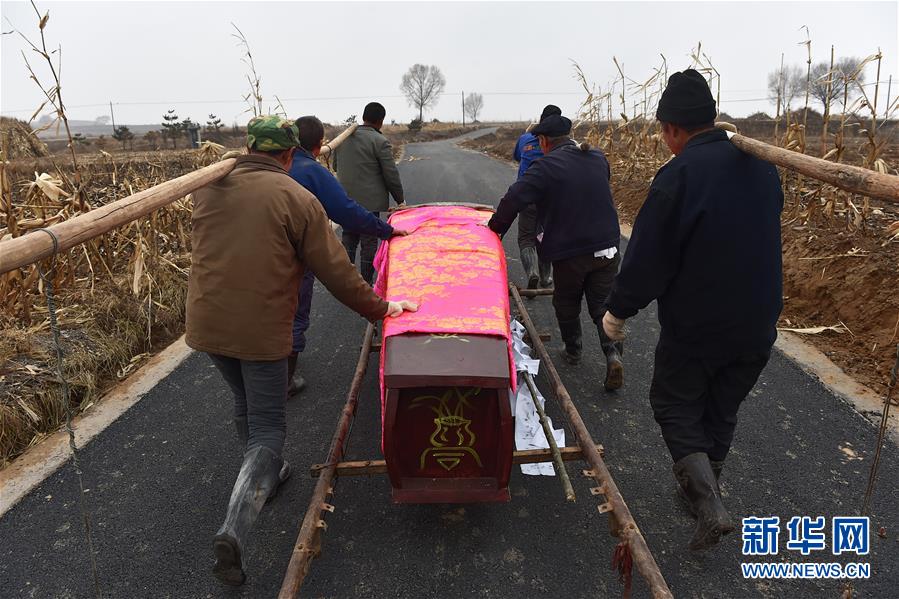 村民抬着张先兔老人的棺木,送老人下葬(2015年11月20日摄)。张先兔老人于2015年11月12日上午在家中去世,享年89岁。从1995年起,山西有16位幸存“慰安妇”代表在中日友人的帮助下分三批起诉日本政府,要求日本政府谢罪赔偿。2007年,日本最高法院终审判决:承认加害的历史事实,但不予赔偿。如今,三批对日本政府索赔起诉的16名慰安妇全部离世,无一人得到道歉与赔偿。对于这16名老人而言,此生愿望已经成为了永久的遗憾。新华社记者詹彦 摄