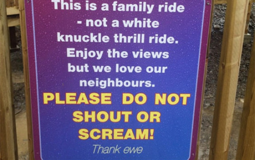 英国西南部的云霄飞车有400米长,一次能乘载28位游客,被称作英国德文郡“最大、最高、最快”的云霄飞车。但为了避免附近住户抗议噪音污染,游乐园竖起了告示牌:“请不要喊叫或尖叫!”(Please do not shout or scream!)
