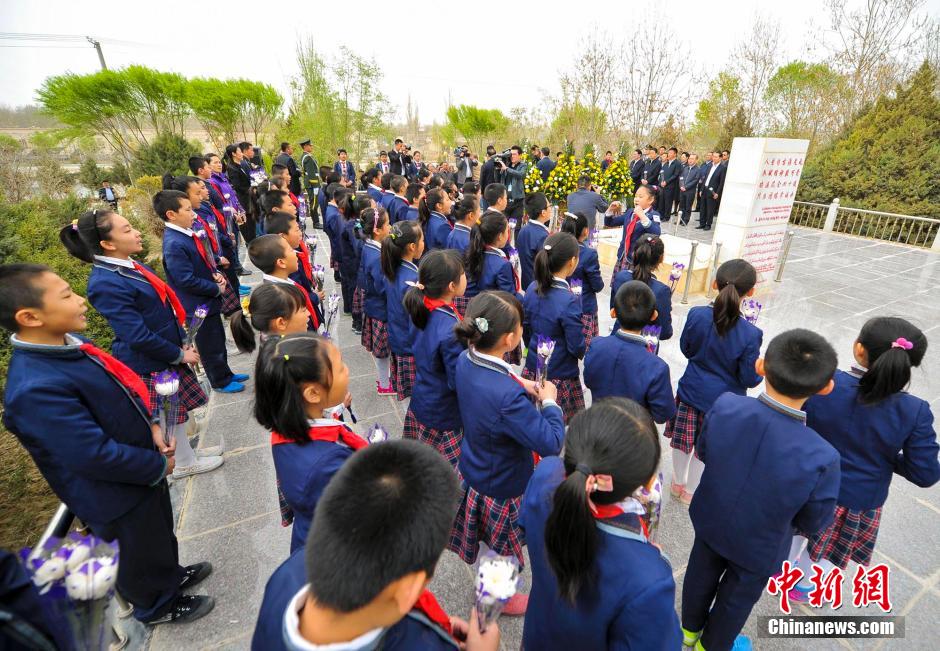 据介绍,王蔚1951年从西北农学院毕业后,服从分配来到新疆工作从事水利工作。1958年调往和田,自此揭开了王蔚兴修水利造福和田民众的序幕,直至生命的最后一刻,王蔚仍不忘乌鲁瓦提水库的建设进度。1991年4月27日,王蔚身患绝症治疗无效与世长辞。王蔚在和田工作的30多年间,主持修建了58座半水库、24座永久性渠首、2万多公里的水利渠道,使和田绝大多数农田成为稳产高产田,造福和田数百万民众,被当地维吾尔族乡亲喻为“水神”。图为祭扫活动现场,小学生手持白菊花,列队在王蔚墓旁。刘新 摄