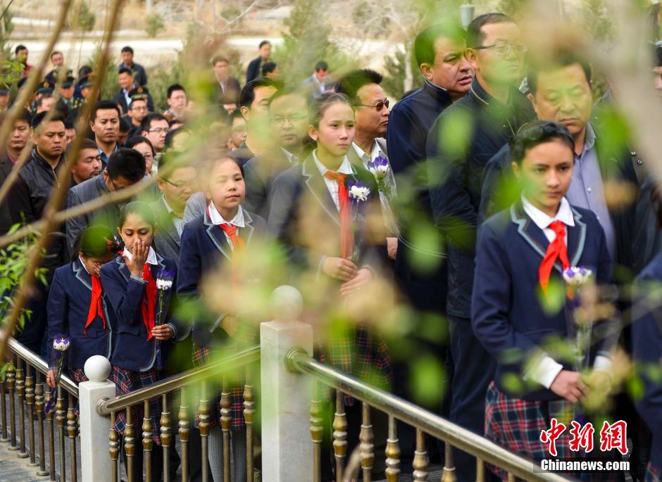 据介绍,王蔚1951年从西北农学院毕业后,服从分配来到新疆工作从事水利工作。1958年调往和田,自此揭开了王蔚兴修水利造福和田民众的序幕,直至生命的最后一刻,王蔚仍不忘乌鲁瓦提水库的建设进度。1991年4月27日,王蔚身患绝症治疗无效与世长辞。王蔚在和田工作的30多年间,主持修建了58座半水库、24座永久性渠首、2万多公里的水利渠道,使和田绝大多数农田成为稳产高产田,造福和田数百万民众,被当地维吾尔族乡亲喻为“水神”。图为祭扫活动现场,小学生手持白菊花,列队在王蔚墓旁。刘新 摄