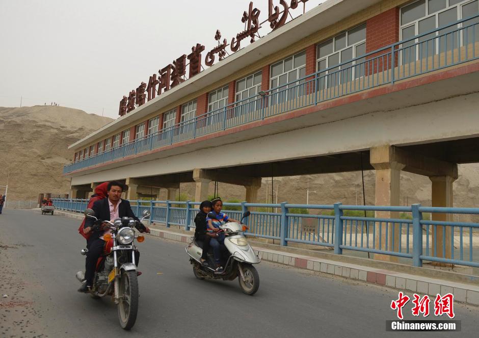 据介绍,王蔚1951年从西北农学院毕业后,服从分配来到新疆工作从事水利工作。1958年调往和田,自此揭开了王蔚兴修水利造福和田民众的序幕,直至生命的最后一刻,王蔚仍不忘乌鲁瓦提水库的建设进度。1991年4月27日,王蔚身患绝症治疗无效与世长辞。王蔚在和田工作的30多年间,主持修建了58座半水库、24座永久性渠首、2万多公里的水利渠道,使和田绝大多数农田成为稳产高产田,造福和田数百万民众,被当地维吾尔族乡亲喻为“水神”。图为当地民众骑摩托车从墨玉县巴格达提村的喀拉喀什河渠首经过。刘新 摄