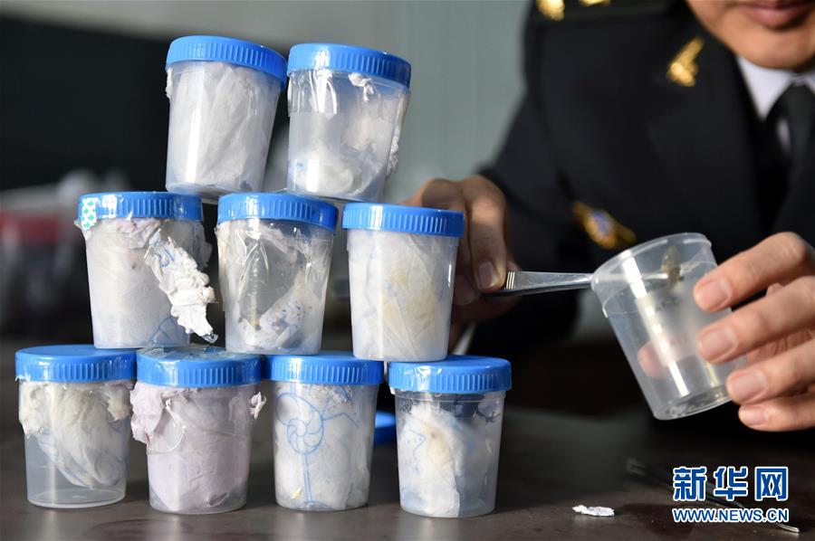 4月18日,北京出入境检验检疫局的工作人员展示截获的装有箭毒蛙的塑料瓶。 新华社记者罗晓光摄