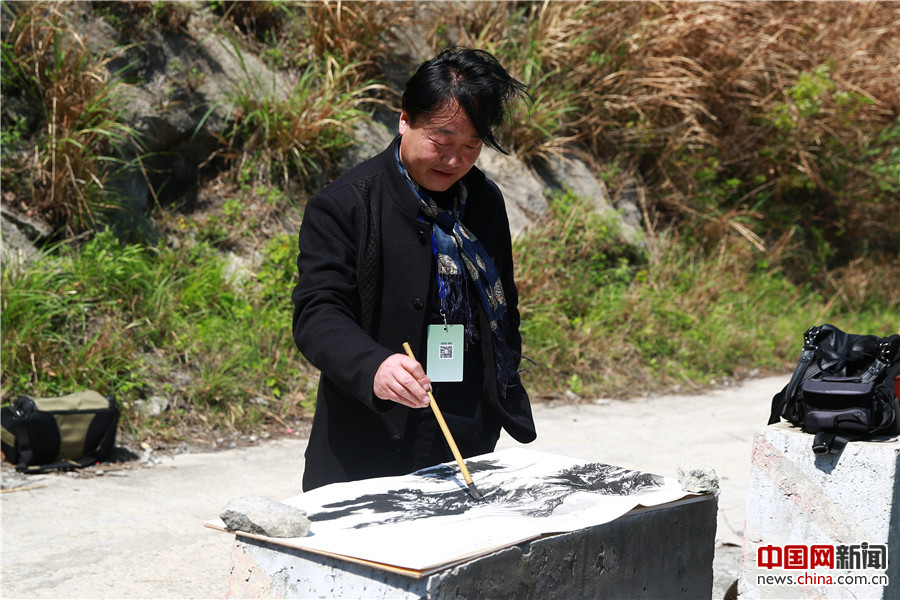 著名画家王江潮在长岭关大桥现场创作,描画高铁经过大别山隧道的情景。