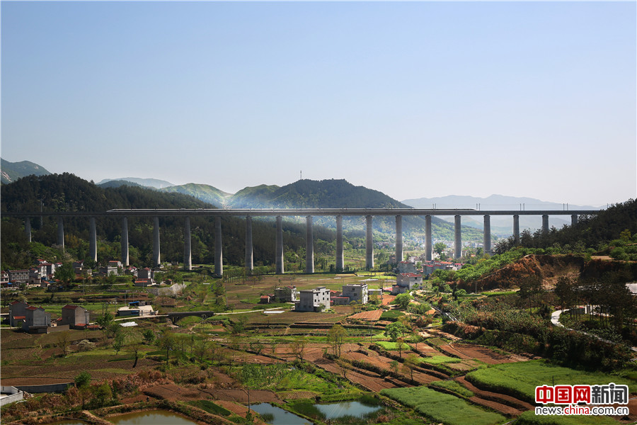 高铁列车通过长岭关大桥。大桥全长1km,是大别山隧道的组成部分。