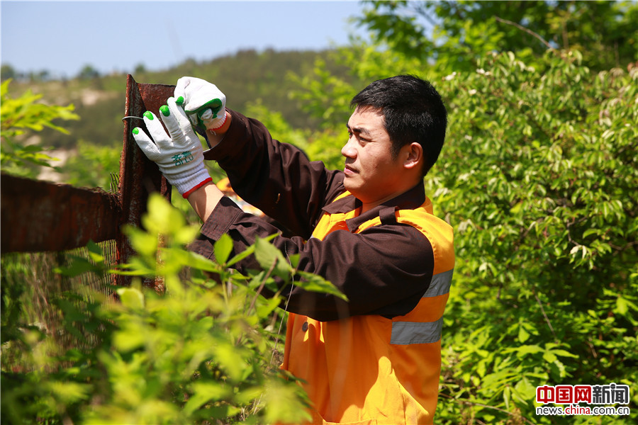 武汉铁路局麻城工务段麻北车间线路工何毅正在进行路外安全巡查工作。
