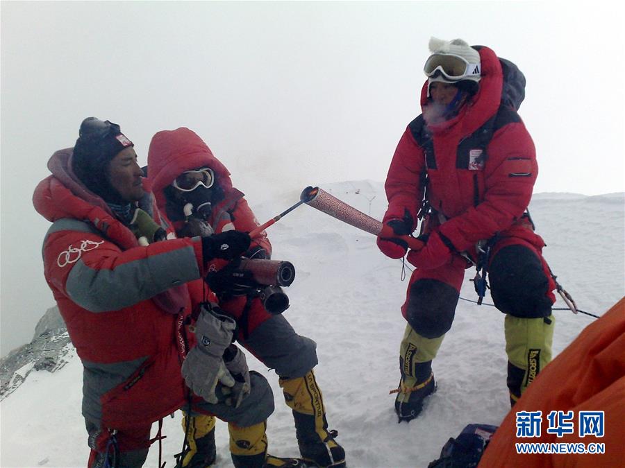 图为2008年5月8日,北京奥运圣火珠峰传递登山队队员罗布占堆(左)点燃第一棒火炬手吉吉手中的“祥云”火炬。自此,北京奥运会火炬登上了世界最高峰珠穆朗玛峰峰顶,实现了奥运圣火在地球之巅传递的人类梦想。新华社发