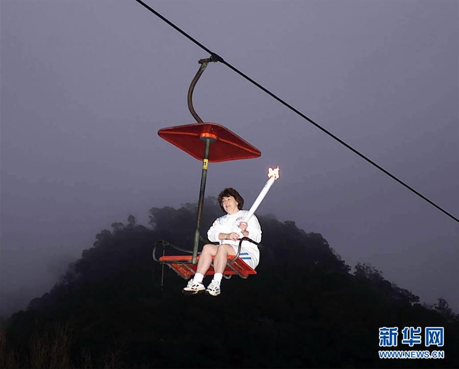 图为2000年8月5日凌晨,一名悉尼奥运会火炬手乘坐空中缆车,穿过位于塔斯马尼亚州朗塞斯顿附近的卡塔拉克特峡谷。 新华社发