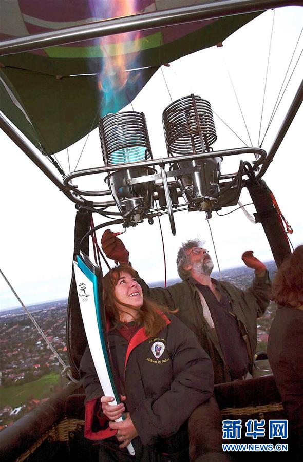 图为2000年7月31日,悉尼奥运会火炬手克里斯·迪沃斯特和他的妻子希瑟驾驶热气球在澳大利亚墨尔本上空传递火炬。新华社发
