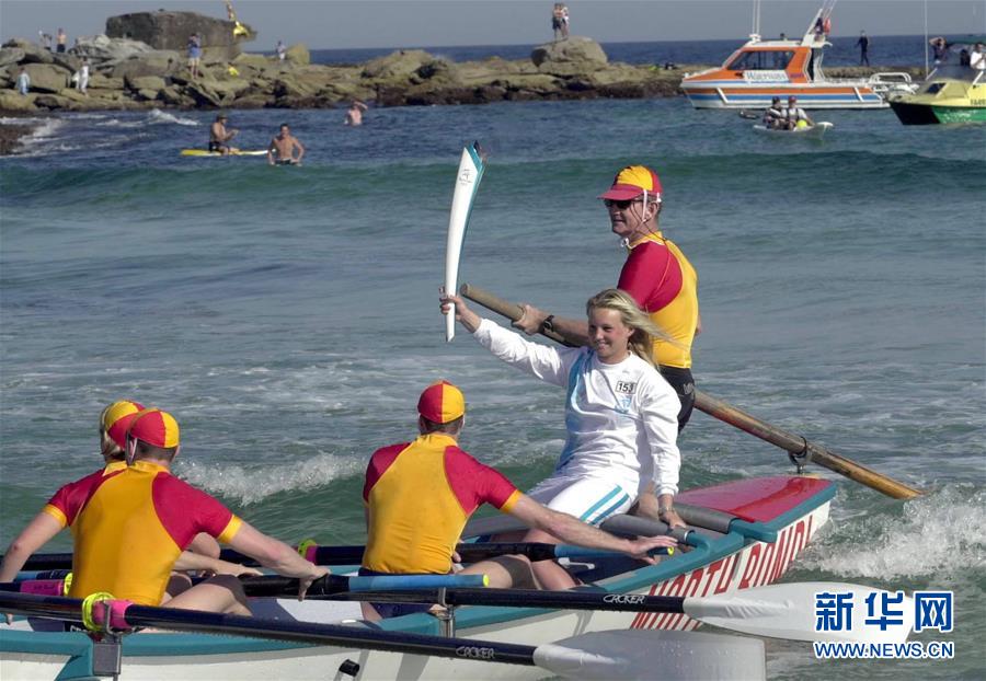 图为2000年9月14日,一名悉尼奥运会火炬手乘坐救生艇穿越塔斯曼海,抵达悉尼著名的邦迪海滩。 新华社发