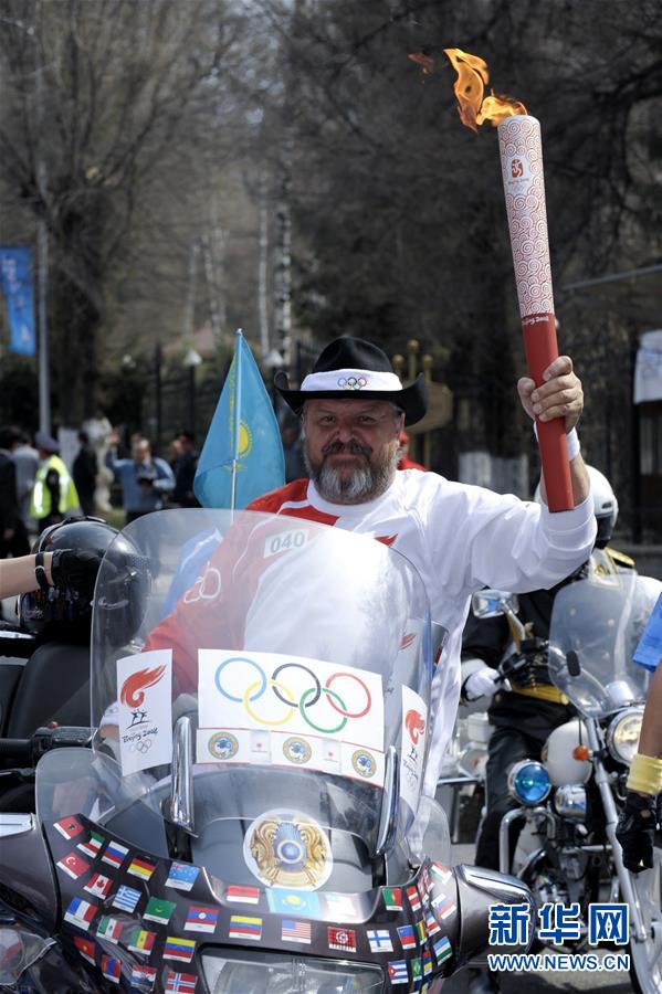 图为2008年4月2日,北京奥运会火炬手彼得鲁欣手持火炬骑着摩托车在阿拉木图进行火炬传递。 新华社发