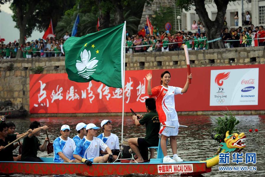 图为2008年5月3日,北京奥运会火炬手彭芷珊(右)手持火炬在龙舟上进行传递。 新华社发