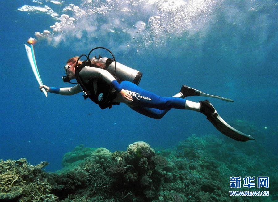 图为2000年6月27日,澳大利亚海洋生物学家温迪·克雷格·邓肯手持第27届悉尼奥运会火炬在澳大利亚东北部的大堡礁附近的海底完成了3分钟的水下火炬接力,奥运圣火首次照亮水下世界。 新华社发