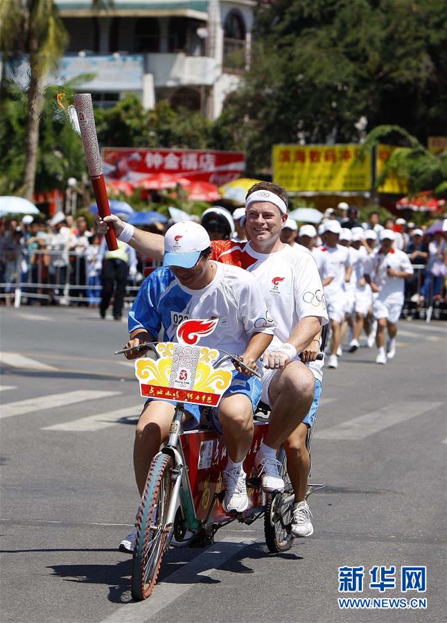 图为2008年5月4日,北京奥运会火炬手哈德森(中)乘坐三人自行车在海南三亚进行火炬传递。 新华社发