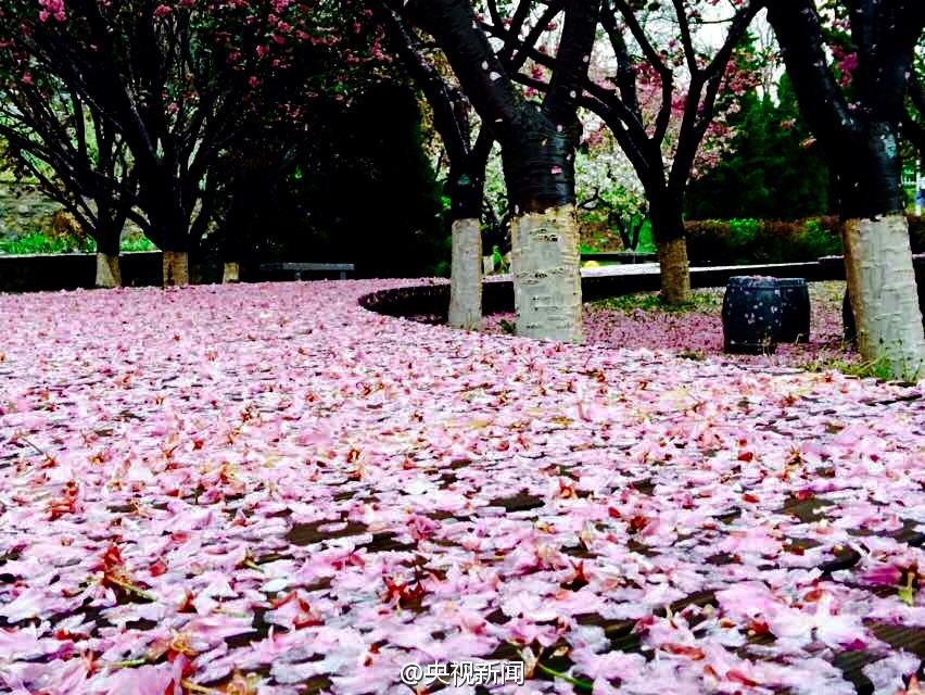 8级阵风袭击大连 风雨过后地面铺满樱花