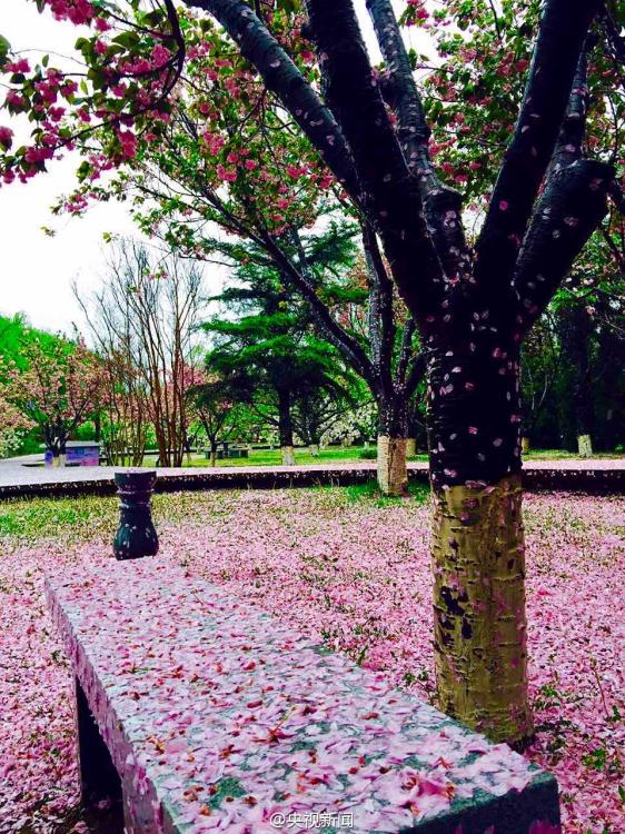 8级阵风袭击大连 风雨过后地面铺满樱花