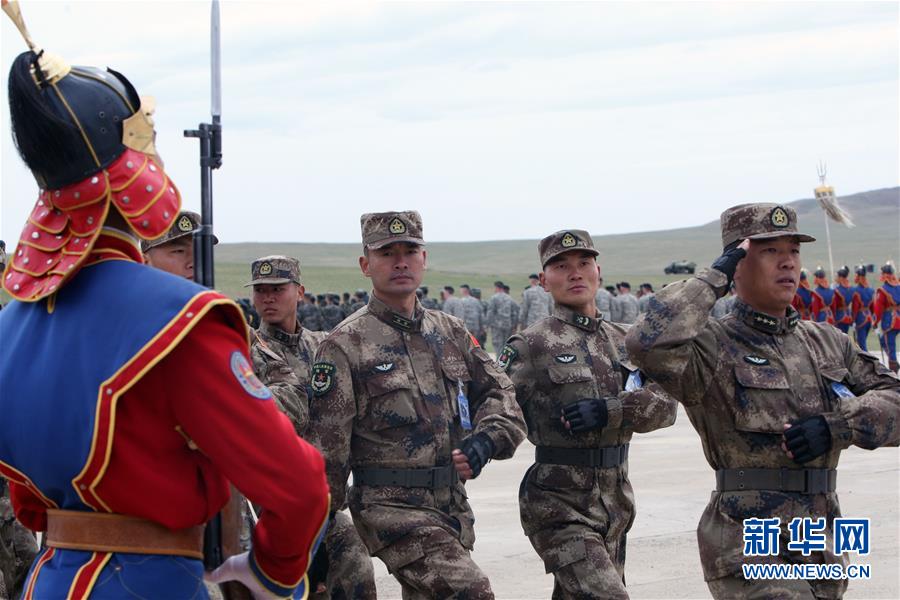 5月22日,在蒙古国首都乌兰巴托以西65公里处的蒙军综合训练中心,中国参演部队接受检阅。 新华社记者郑闯摄