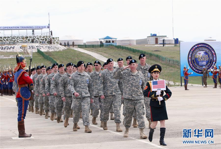 5月22日,在蒙古国首都乌兰巴托以西65公里处的蒙军综合训练中心,美国参演部队接受检阅。 新华社记者郑闯摄