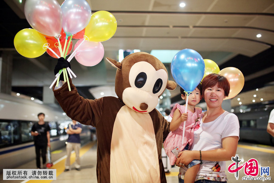 6月1日,小乘客和妈妈跟卡通人物合影留念。中国网郑亮摄影