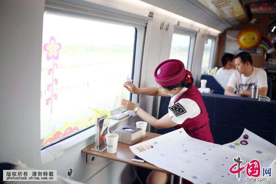 6月1日,北京客运段高铁二队佳音乘务组在G57次列车餐车上,将餐车布置成“六一”节日氛围的主题餐厅。中国网郑亮摄影