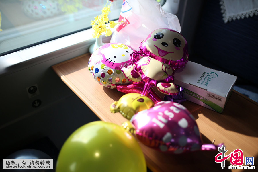 6月1日,北京客运段高铁二队佳音乘务组在G57次列车餐车上,将餐车布置成“六一”节日氛围的主题餐厅。中国网郑亮摄影