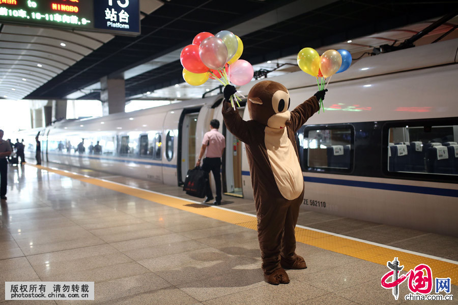 6月1日,北京客运段高铁二队佳音乘务组员扮演卡通人物迎接小乘客的到来。中国网郑亮摄影