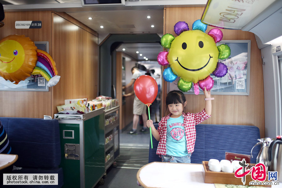 6月1日,布置成“六一”节日氛围的主题餐车很受小乘客的青睐。中国网郑亮摄影