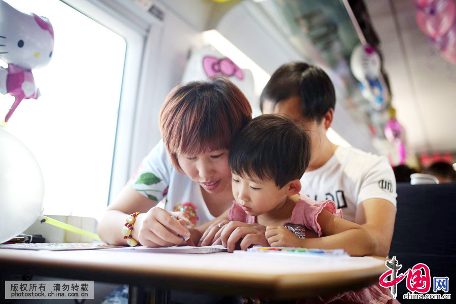 6月1日,家长和孩子在充满节日气氛的车厢里一起游戏。中国网郑亮摄影