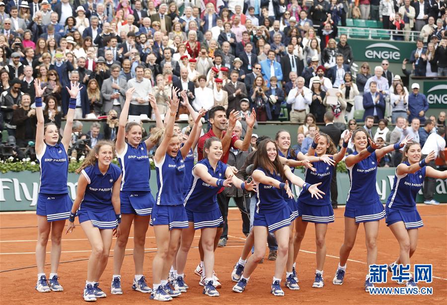 6月5日,德约科维奇(后排中)夺冠后与球童一道向观众致意。当日,在2016年法国网球公开赛男单决赛中,塞尔维亚选手德约科维奇以3比1战胜英国选手默里,获得冠军,从而实现职业生涯“全满贯”伟业。新华社记者叶平凡摄