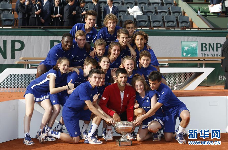 6月5日,德约科维奇(前排中)在颁奖仪式后与球童合影。当日,在2016年法国网球公开赛男单决赛中,塞尔维亚选手德约科维奇以3比1战胜英国选手默里,获得冠军,从而实现职业生涯“全满贯”伟业。新华社记者叶平凡摄