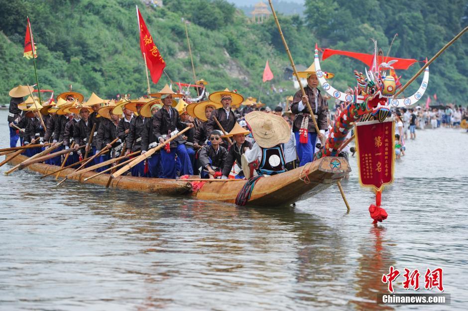 6月29日,苗族独木龙舟节在贵州省台江县清水江畔施洞镇举行,40余条苗族独木龙舟齐聚清水江畔,欢度一年一度的传统盛会。苗族独木龙舟节是国家级非物质文化遗产保护项目,迄今已有上千年的历史,是清水江流域苗族同胞祈祷风调雨顺、五谷丰登,传承民族文化的重要载体。独木龙舟从采木到凿舟、从下水到竞渡,其程序都有严格的仪规、禁忌和传说,无不表现出一种古老而神秘的气息。图为一条龙头前挂着上一届比赛锦旗的龙舟凯旋。中新社记者 贺俊怡 摄