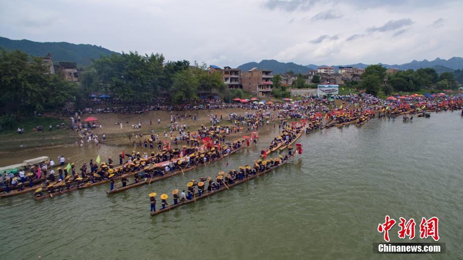6月29日,苗族独木龙舟节在贵州省台江县清水江畔施洞镇举行,40余条苗族独木龙舟齐聚清水江畔,欢度一年一度的传统盛会。苗族独木龙舟节是国家级非物质文化遗产保护项目,迄今已有上千年的历史,是清水江流域苗族同胞祈祷风调雨顺、五谷丰登,传承民族文化的重要载体。独木龙舟从采木到凿舟、从下水到竞渡,其程序都有严格的仪规、禁忌和传说,无不表现出一种古老而神秘的气息。中新社记者 贺俊怡 摄