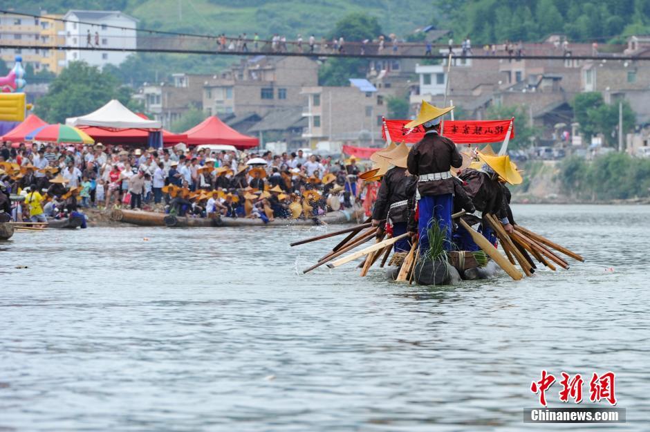 6月29日,苗族独木龙舟节在贵州省台江县清水江畔施洞镇举行,40余条苗族独木龙舟齐聚清水江畔,欢度一年一度的传统盛会。苗族独木龙舟节是国家级非物质文化遗产保护项目,迄今已有上千年的历史,是清水江流域苗族同胞祈祷风调雨顺、五谷丰登,传承民族文化的重要载体。独木龙舟从采木到凿舟、从下水到竞渡,其程序都有严格的仪规、禁忌和传说,无不表现出一种古老而神秘的气息。中新社记者 贺俊怡 摄