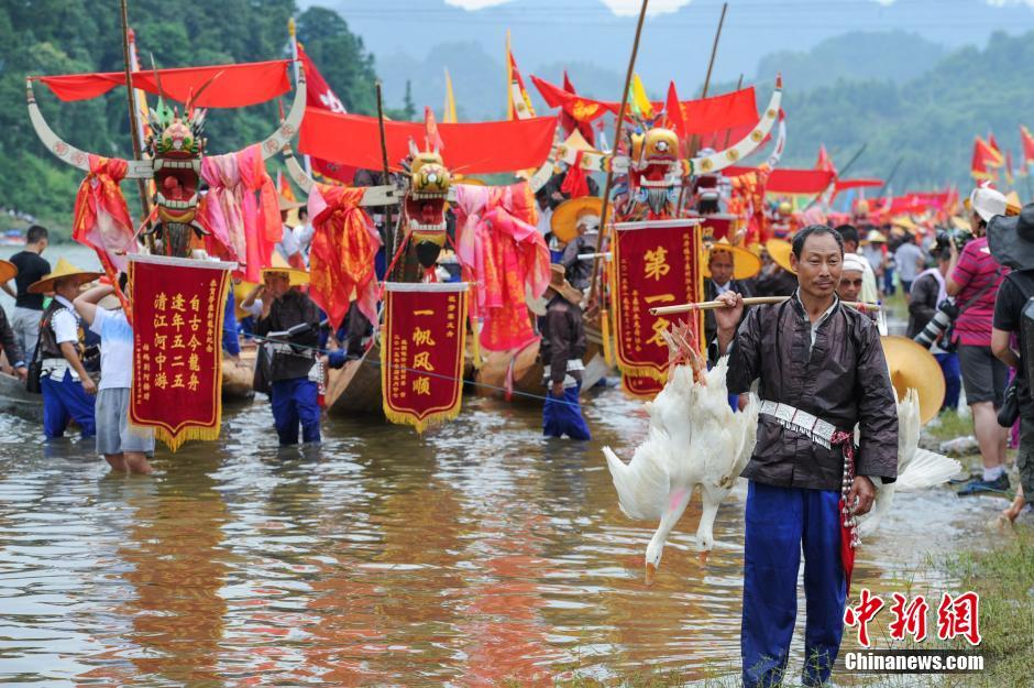 6月29日,苗族独木龙舟节在贵州省台江县清水江畔施洞镇举行,40余条苗族独木龙舟齐聚清水江畔,欢度一年一度的传统盛会。苗族独木龙舟节是国家级非物质文化遗产保护项目,迄今已有上千年的历史,是清水江流域苗族同胞祈祷风调雨顺、五谷丰登,传承民族文化的重要载体。独木龙舟从采木到凿舟、从下水到竞渡,其程序都有严格的仪规、禁忌和传说,无不表现出一种古老而神秘的气息。图为一位苗族男子肩挑鸭子准备进行接龙仪式。中新社记者 贺俊怡 摄