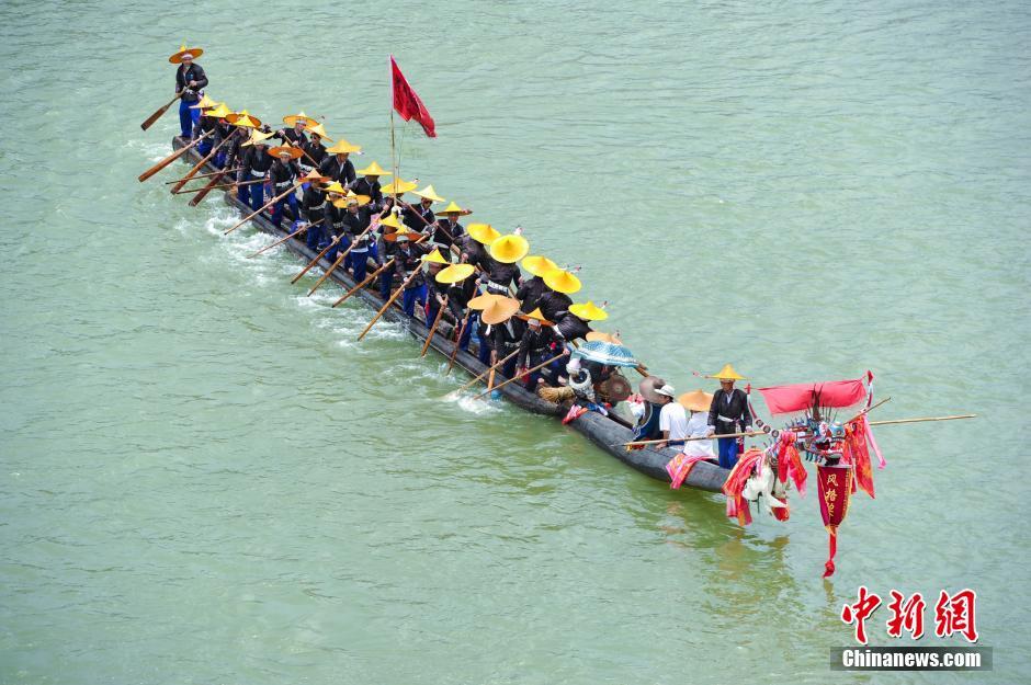 6月29日,苗族独木龙舟节在贵州省台江县清水江畔施洞镇举行,40余条苗族独木龙舟齐聚清水江畔,欢度一年一度的传统盛会。苗族独木龙舟节是国家级非物质文化遗产保护项目,迄今已有上千年的历史,是清水江流域苗族同胞祈祷风调雨顺、五谷丰登,传承民族文化的重要载体。独木龙舟从采木到凿舟、从下水到竞渡,其程序都有严格的仪规、禁忌和传说,无不表现出一种古老而神秘的气息。中新社记者 贺俊怡 摄