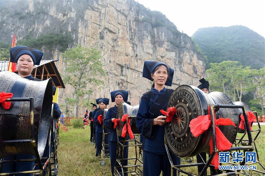 7月15日,当地民众在广西宁明县左江花山景区敲起铜鼓为“申遗”助力。
