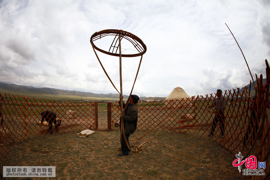 为传承哈萨克族毡房搭建技艺,当地农牧民经常举行搭毡房比赛。孙继虎 摄