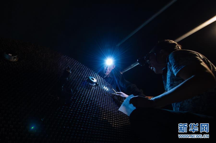 工作人员对郭守敬巡天望远镜焦面板光纤定位单元进行更换维护(7月14日摄)。