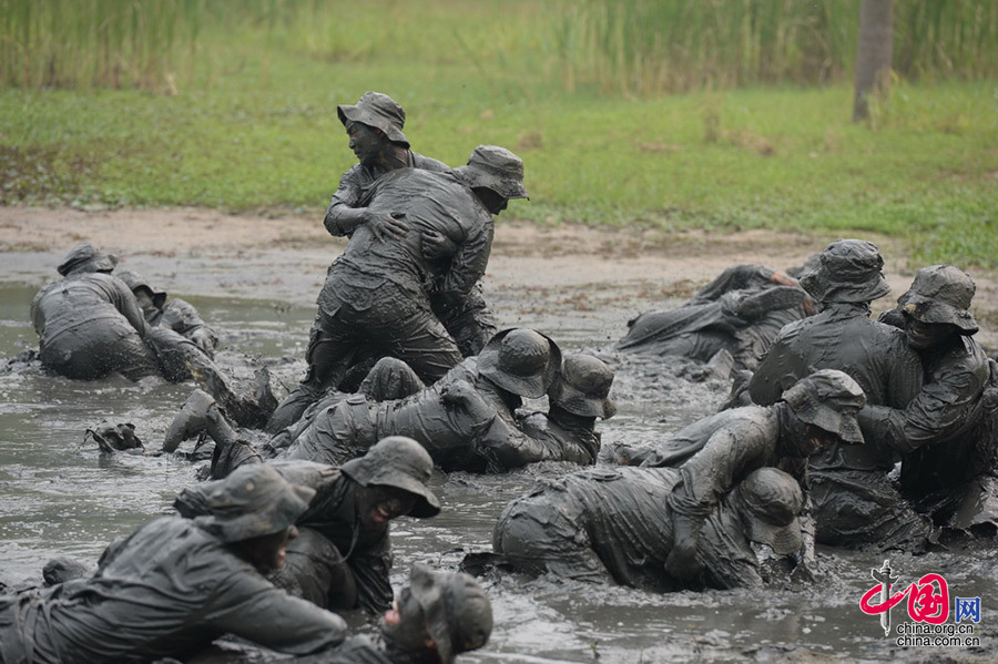 模拟战场环境,队员们在泥潭中进行摔跤训练。 余红春摄影报道