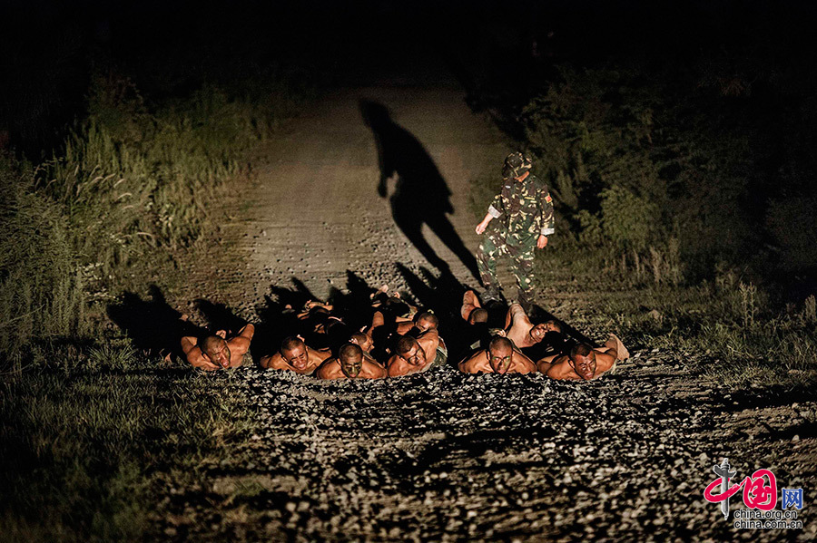 “夜间渗透”训练课目要求队员们捆绑手脚,利用双脚内侧蹬力在山路上蠕动。 余红春 摄影报道