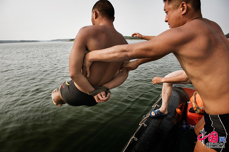 上一期集训的6号队员李兴(右)如今成为这期集训的教员,他将这期集训的6号队员(左)捆绑住手脚后扔进水中,进行水中求生课目训练。他像当年要求自己一样严格要求队员们,为了相同的荣誉,他们风雨同舟,并肩前行。余红春 摄影报道