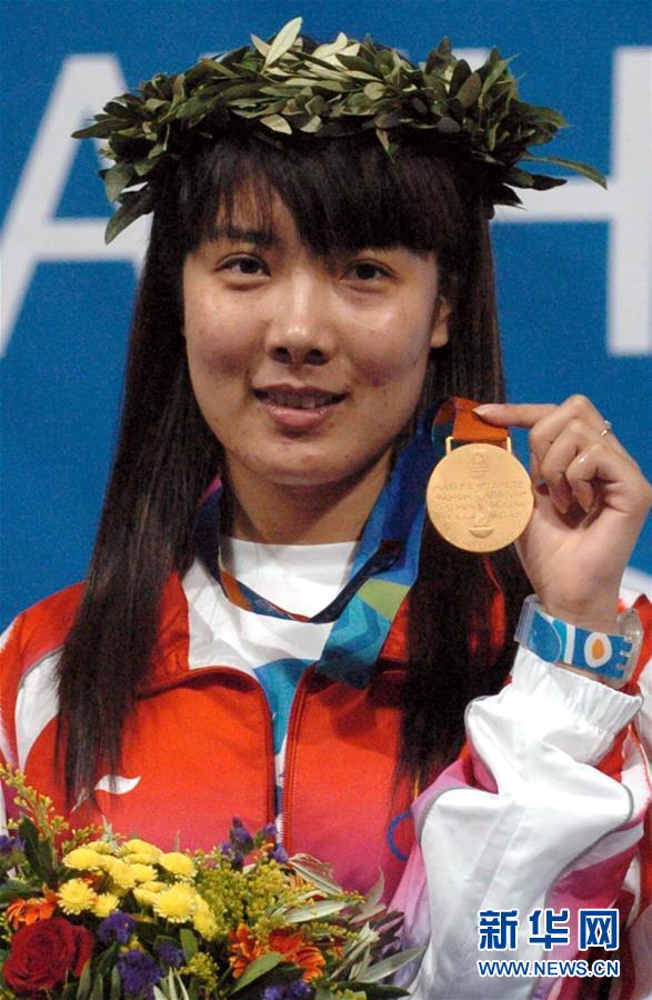 2004年8月14日,在雅典奥运会射击女子10米气步枪决赛中,中国选手杜丽以502环的成绩夺冠,为中国队获得这届奥运会首枚金牌。图为杜丽在领奖台上展示金牌。新华社发