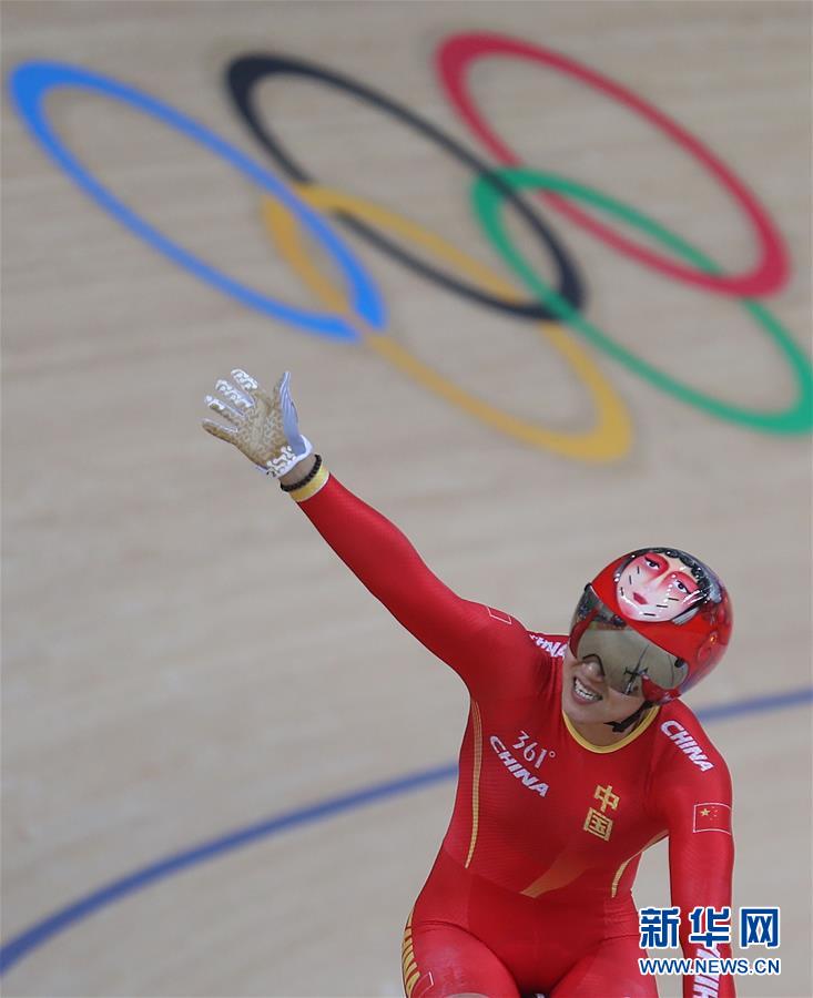 8月12日,中国队选手宫金杰庆祝夺冠。当日,在2016年里约奥运会场地自行车女子团体竞速赛决赛中,由宫金杰和钟天使组成的中国队以56秒062的成绩夺冠。新华社记者曹灿摄