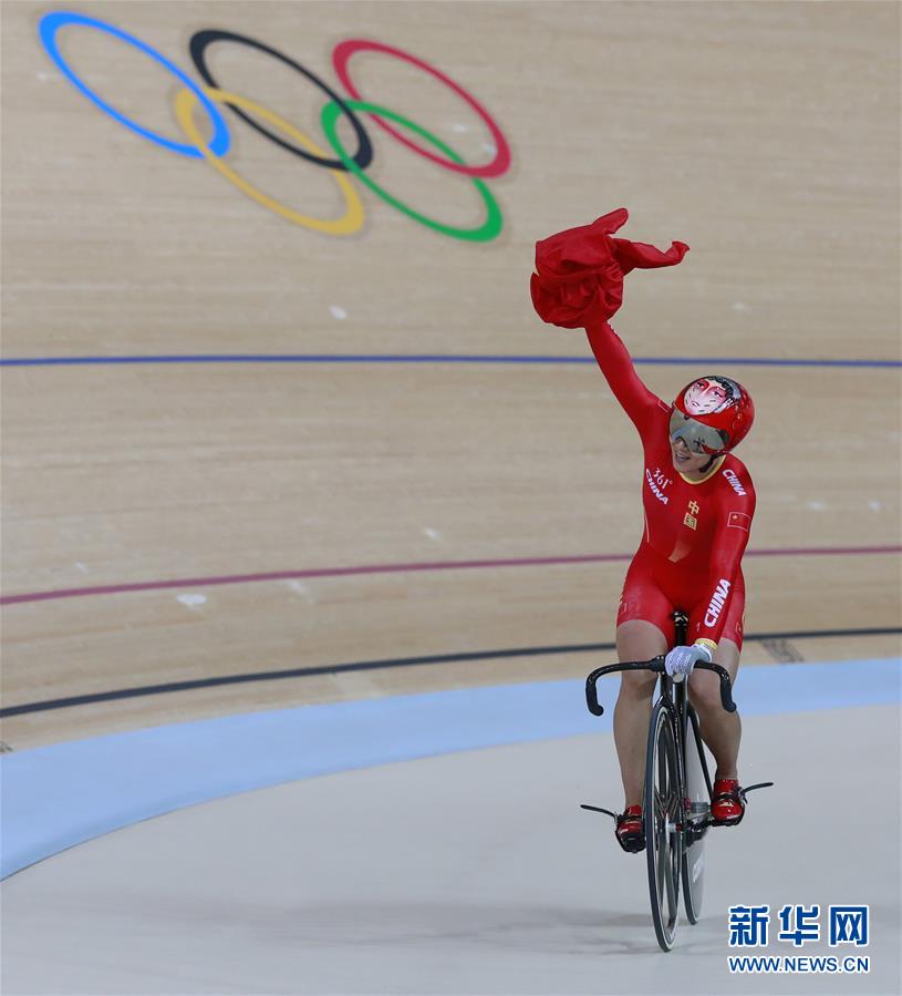 8月12日,中国队选手宫金杰庆祝夺冠。当日,在2016年里约奥运会场地自行车女子团体竞速赛决赛中,由宫金杰和钟天使组成的中国队以56秒062的成绩夺冠。新华社记者任正来摄