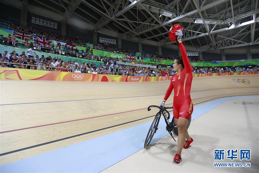 8月12日,中国队选手宫金杰夺冠后向观众致意。当日,在2016年里约奥运会场地自行车女子团体竞速赛决赛中,由宫金杰和钟天使组成的中国队以56秒062的成绩夺冠。新华社记者任正来摄