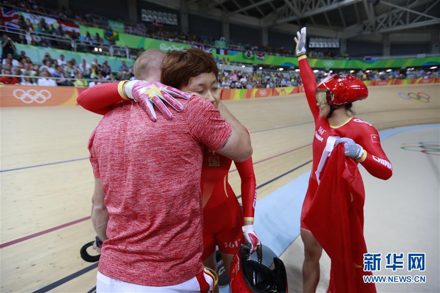 8月12日,中国队选手钟天使(中)赛后与教练拥抱,宫金杰向观众挥手致意。当日,在2016年里约奥运会场地自行车女子团体竞速赛决赛中,由宫金杰和钟天使组成的中国队以56秒062的成绩夺冠。新华社记者任正来摄