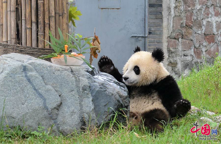 网红大熊猫“蔓越莓”一岁生日,工作人员用冰、苹果、胡萝卜和竹叶做了一个大蛋糕。