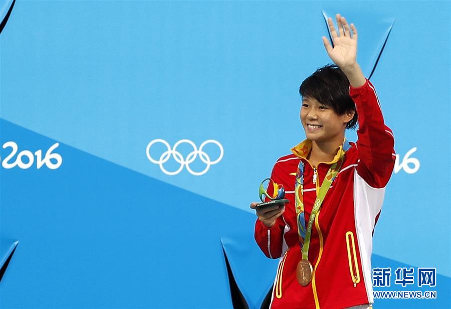 这是施廷懋在里约奥运会女子三米跳板跳水颁奖仪式上(2016年8月14日摄)。8月14日,在2016年里约奥运会跳水女子三米板决赛中,中国选手施廷懋以406.05分的总成绩夺冠。新华社发