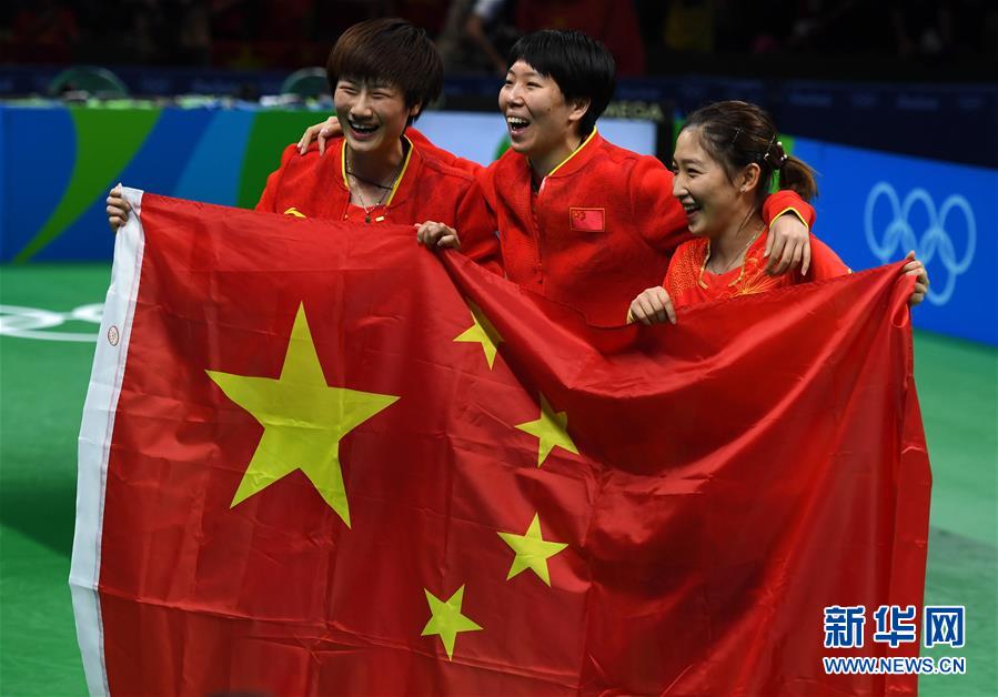 8月16日,中国队选手丁宁(左)、李晓霞(中)和刘诗雯庆祝获胜。 当日,在2016年里约奥运会乒乓球女子团体赛决赛中,中国队以3比0战胜德国队获得金牌。新华社记者 殷博古 摄